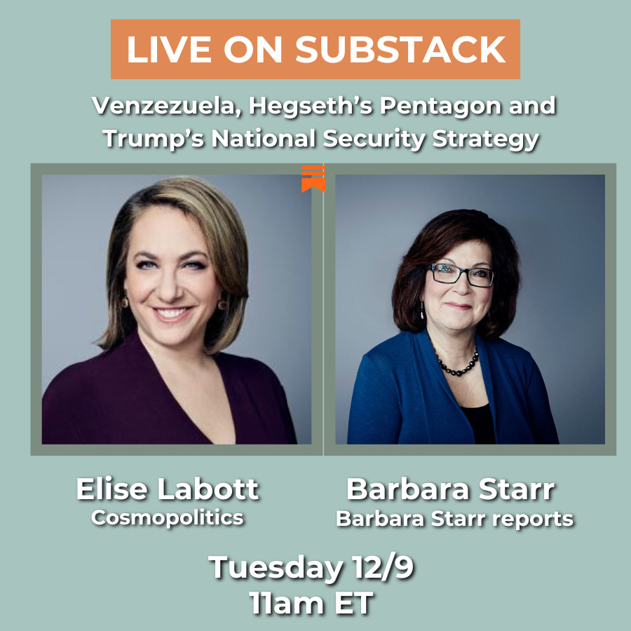 TODAY at 11am ET/8a PT to discuss the NSS, developments on Venezuela and controversy over Pete Hegseth’s leadership. If you caught our last conversation, you know Barbara’s analysis is informed, sharp and essential. If you have a question for our conversation, please put it in the comments!The most telling moment about the Trump administration’s new National Security Strategy came not from Washington, but from Moscow. Vladimir Putin’s spokesperson Dmitry Peskov welcomed the strategy as “largely consistent with our vision,” calling it “a positive step.” When the Kremlin is praising your foreign policy document, you might want to ask yourself what you’ve just given away.