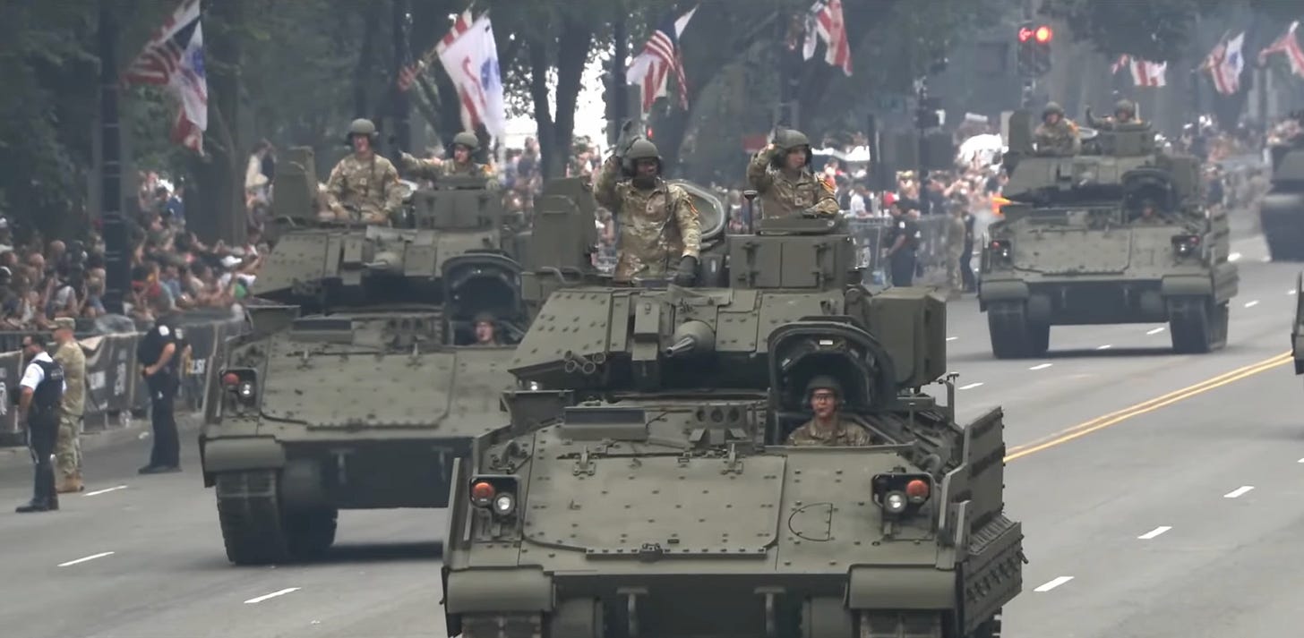 Trump's rare display of self-restraint helped. He kept his remarks focused on the Army's history rather than his usual grievances, and the troops waved cheerfully from their Abrams tanks instead of goose-stepping menacingly. This was a nice celebration of the military, exactly what it was supposed to be. And honestly, I'm a sucker for a flyover.